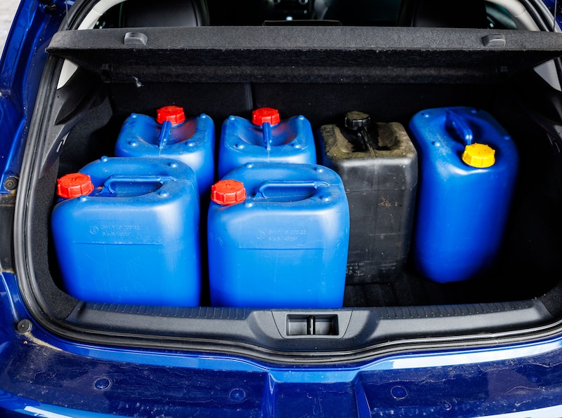 „Levensgevaarlijk, doe het niet”, zegt de brandweer over de jerrycans in de kofferbakken. Maar de Europese vervoersregeling voor gevaarlijke stoffen (ADR) staat ondanks de risico’s het vervoer van maximaal 240 liter toe.