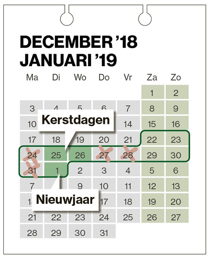 Komende decembermaand kun je nog wel gebruik maken van het voordeel van dit jaar. Kerst en Nieuwjaar zijn samen goed voor elf vrije dagen tegenover vier op te nemen vakantiedagen.