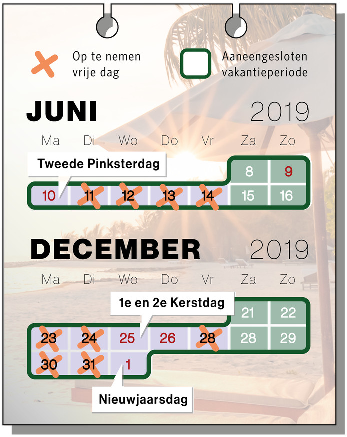 Gemiddeld heeft de Nederlander 25 vakantiedagen. Maar wie de jaarkalender van 2019 er bij neemt, kan in principe 55 dagen op vakantie, met weekend- en feestdagen erbij.