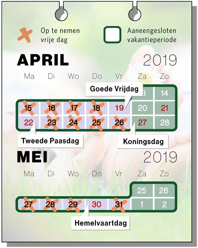 Net zo’n lange periode kun je ‘scoren’ in april. Tweede Paasdag krijg je cadeau op maandag 22 april. Als je daar de vier dagen van dinsdag 23 tot vrijdag 26 april bij neemt, heb je weer negen dagen vrij dankzij het weekend ervoor en erna. Krijg je Goede Vrijdag een vrije dag van je baas en neem je de vier dagen ervoor ook vrij, dan kun je zelfs zestien dagen weg.
