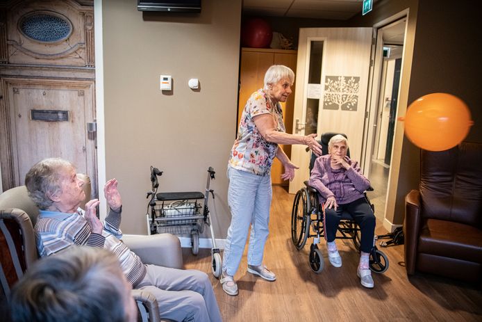 Vandaag heeft mevrouw Akkermans goede zin. De test was negatief, dus ze mag naar de sjoelmiddag. In het restaurant staan de stoelen in een kring om de sjoelbakken, keurig 1,5 meter uit elkaar, tot enig ongenoegen van de bewoners (‘we zijn allemaal half doof, je verstaat elkaar niet. Het is er niet gezelliger op geworden’). De vrijwilligers die de sjoelschijven aangeven, dragen plastic handschoentjes. De bewoners niet. Mondkapjes draagt niemand, hoewel het aantal coronabesmettingen ook in verpleeghuizen weer oploopt en zowel personeel als bezoek in verpleeg- huizen in Amsterdam, Rotterdam en Den Haag sinds deze week preventief een medisch mondkapje op moet. ,,Als het verplicht wordt, zullen wij dat natuurlijk ook doen. Maar zo lang het kan, kiezen we voor gezond verstand: thuisblijven bij klachten, afstand houden, handen wassen. Bewoners met dementie raken in de war van mondkapjes. Ze herkennen vertrouwde gezichten niet meer’’, verklaart manager Petra van den Bunder van Hagedonk, dat deel uitmaakt van de Brabantse zorgorganisatie Thebe.
