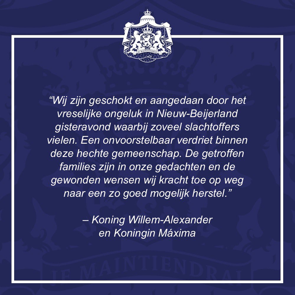 Het koninklijk paar noemt het “een onvoorstelbaar verdriet binnen de hechte gemeenschap”. Ook schrijven ze: “De getroffen families zijn in onze gedachten en de gewonden wensen wij kracht toe naar een zo goed mogelijk herstel.”